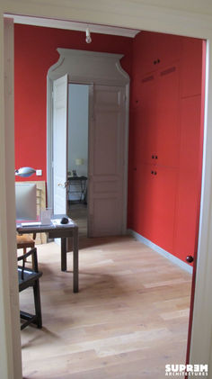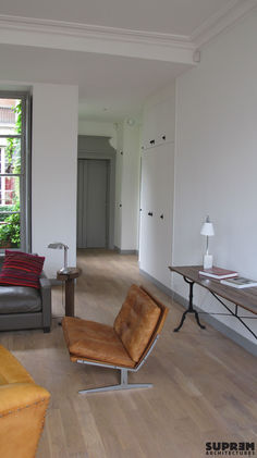 Suprem Architectures prend le parti de mêler ancien et contemporain. Les volumes intérieurs sont conservés; les circulations sont facilitées. Les moulures, les volets intérieurs et les portes à fronton rappellent que nous sommes bien à Paris ; la cuisine en laque, la cheminée en acier patiné, l’escamotage des rangements dans les murs ancrent l’appartement aujourd’hui.